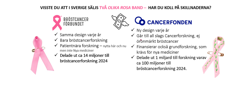 I Sverige finns framförallt två organisationer som säljer ett rosa band. Två olika organisationer och två olika band med olika syften. Vi tycker inte man kan tävla i cancer och lägger ingen värdering kring att ena är bättre eller sämre.